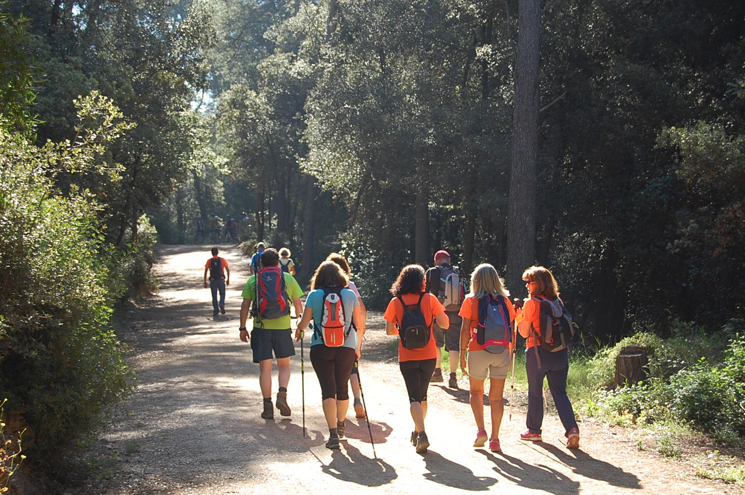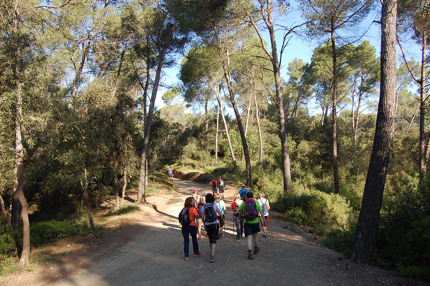 Tot i que al començar a caminar feia fresca, de seguida que es va alçar el sol ja ens sobrava la jaqueta i tots ja anàvem amb la samarreta de màniga curta preparats a suar-la com cal en aquesta època de l'any. Vàrem anar alternant pistes i senders coberts per l'esplèndida ombra dels pins i alzines que ens protegien del sol però no dels ciclistes de muntanya que sovint ens anàvem trobant pel davant i pel darrera.